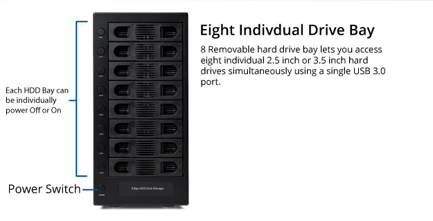 SYBA SY-ENC50119 8 bay 2.5" and 3.5" USB3.0 SATA External Enclosure is a quick and simple way to expand storage capacity. Latest controller and firmware support 8 x 22TB drives. Unique independent switch designallows drives to be powered off individually, prolonging the life of the drives.