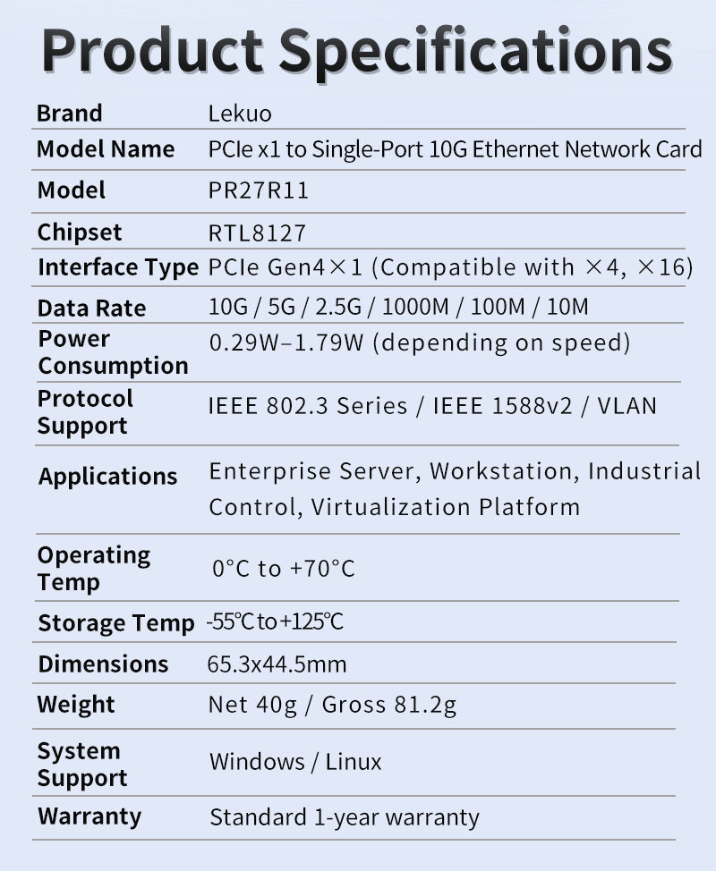 The SI-PEX24102 is an 10G ethernet card which offers significantly faster data transfer speeds compared to a standard gigabit ethernet card, allowing for smoother handling of large data files, improved network performance for demanding applications like video streaming or high-resolution graphics, and better scalability to accommodate growing network needs, all while minimizing data bottlenecks in high-traffic environments. The SI-PEX24102 NIC supports 10GBASE-T Ethernet in compliance with the IEEE 802.3an standard, as well as 5 Gbps and 2.5 Gbps Ethernet speeds over standard Cat 5e and Cat 6 copper cables. It is also compliant with IEEE 802.3bz standard and backwards-compatible with legacy 1000BASE-T Ethernet. The RTL8127AT-CG is a single-chip, single-port, high-performance PCIe 3.0 Multi-Gig 10GBASE-T/5GBASE-T/2.5GBASE-T/ 1000BASE-T/100BASE-TX Ethernet adapter.